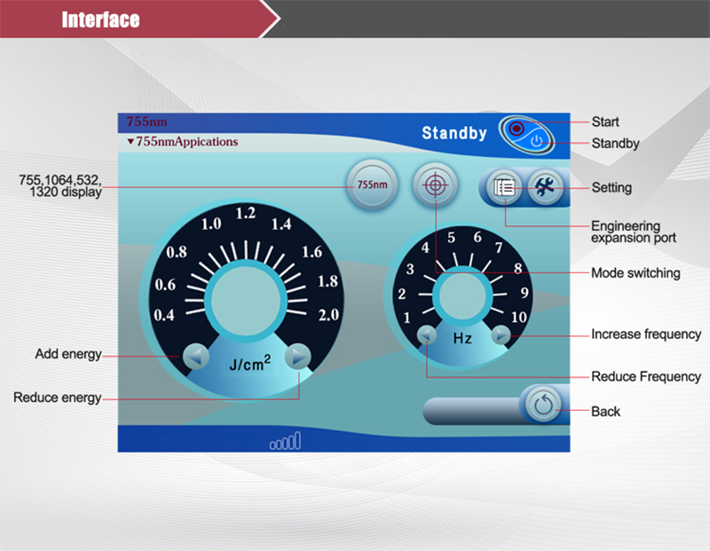 755nm: The sunburn, freckles, chlasma, age spots, dry spots, dermis spots and other stubborn stains. Red and black and so on.