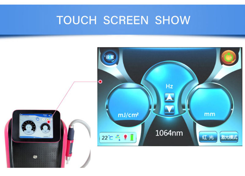 Adopting the Q-Switched ND: YAG model, the machine uses laser to emit high energy instantaneously which smashing the pigment of pathological tissues, namely the laser leading explosive effect: High energy emits instantaneously, making particular wavelength laser penetrating epidermis and getting into pathological pigment tissues in only 6nms. Then pigments expand in top speed and explode. The superficial epidermis would be bounded out of body, other part of the pigments would split into granules which would be engulfed by macrophages, then exclude by the lymphatic system finally. The pigment becomes shallow gradually finally disappear while the surrounding normal skin tissues keep sound as they do not absorb particular wavelength laser.