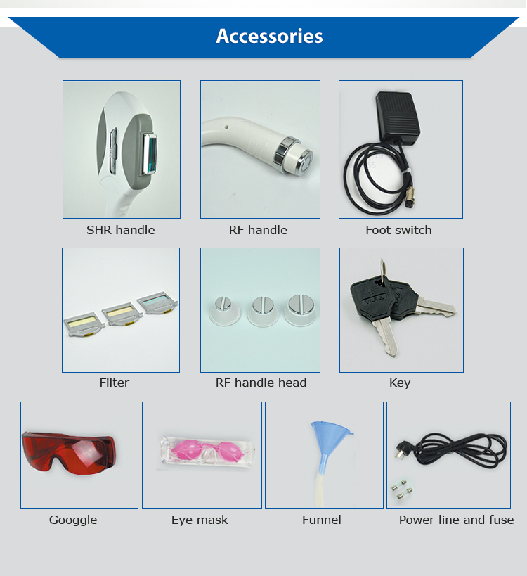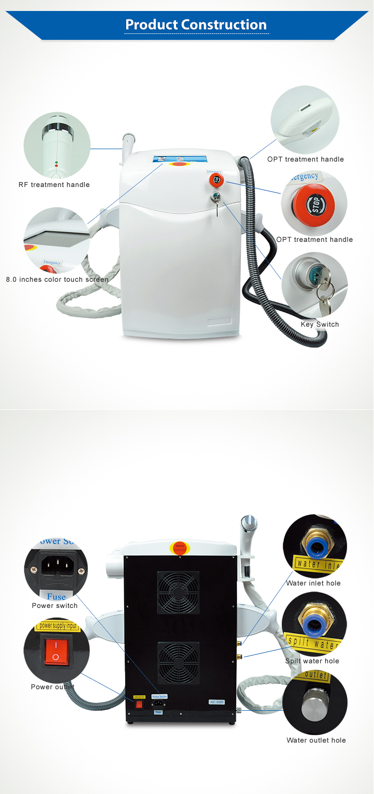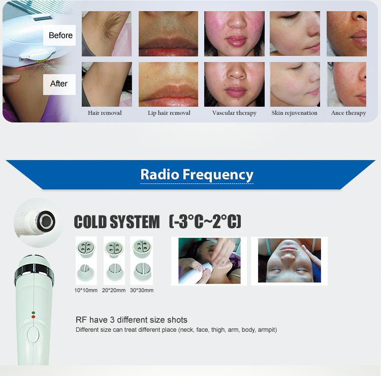 E light reputation beauty instrument core technology mainly have three: RF + light + epidermis cooling, it fully combined with light (IPL) and radio frequency (RF) of their respective advantages, use of skin caused by selective absorption of light energy target tissue and normal skin impedance difference, in the case of low light intensity strengthen the absorption of RF target tissue, make the organization to achieve the ideal temperature rise.Rf penetration to the skin deep, no selective absorption, and its conductivity is closely related to the temperature in the skin.E light reputation beautiful skin, it is combined with the advantages of light and radio frequency, using the skin on the selective absorption of light energy, strengthen the skin to absorb rf.At the same time, radio frequency (rf) surface contact cooling technology eliminates the strong light account of the heat effect of discomfort and complications, improving curative effect and safety of breakthroug
