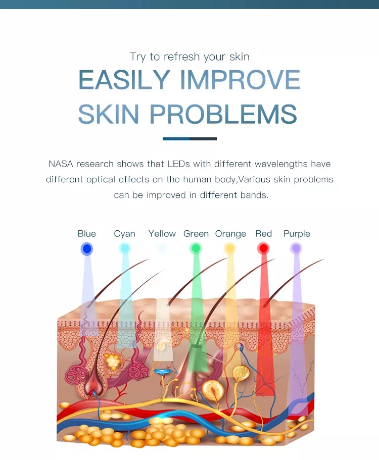 Photon light therapy: Lights of different wavelengths penetrate skin layers of different depths, accelerating the regeneration of cells and collagen so as to solve various skin problems and realize skin rejuvenation.
