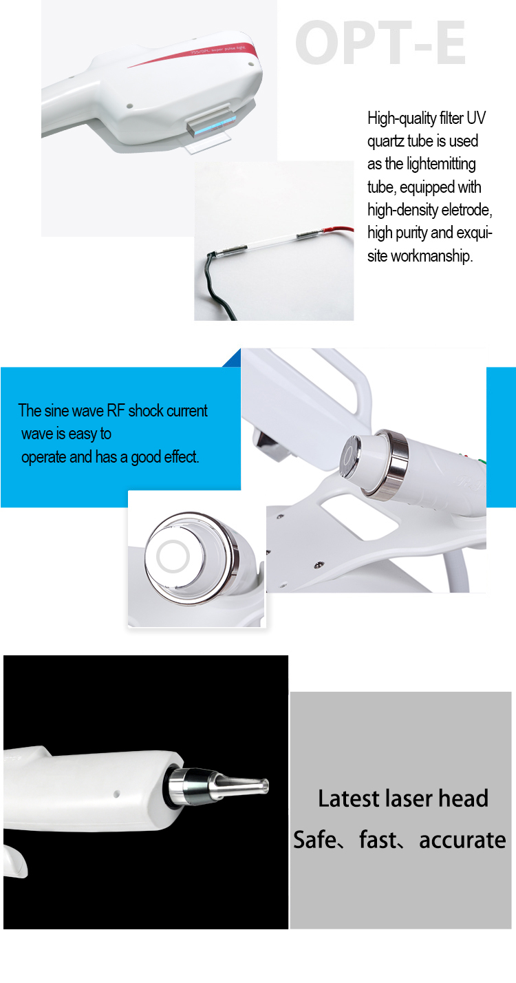 The core technology of E-light beauty skin therapy has three points : RF + light energy + epidernal cooling , which fully combines the respective advantages of light energy (IPL) and (RF) radio frequency , and utilizes the selective absorption of light energy by the skin to cause target tissue at a lower itensity of light energy , so that the tissue reches a desired temperature rise . Radio frequency penetrates deep into the skin , has no selective absorption , and its cinductivity in the skin is closely related to temperature .E-light beauty skin therapu combines the advantages of light energy and radio frequency , and utillzes the selective absorption of light energy by the skin to strengthen the absorption of radio frequency by skin tissue . At the same time , the RF surface contact cooling technology eliminates the discomfort and complications caused by the intense heat of the strong light , ans has a breakthrough in efficacy and safety.