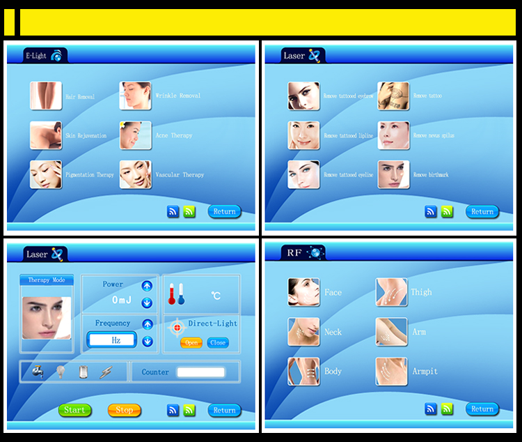 | Features | Wrinkle Remover, Pigment Removal, Hair Removal, Whitening, Blood Vessels Removal, Skin Rejuvenation, Face Lift, Acne Treatment, Black Head Remover, Pigmentation Correctors, Skin Tightening, Lightening, Tattoo Removal | ||