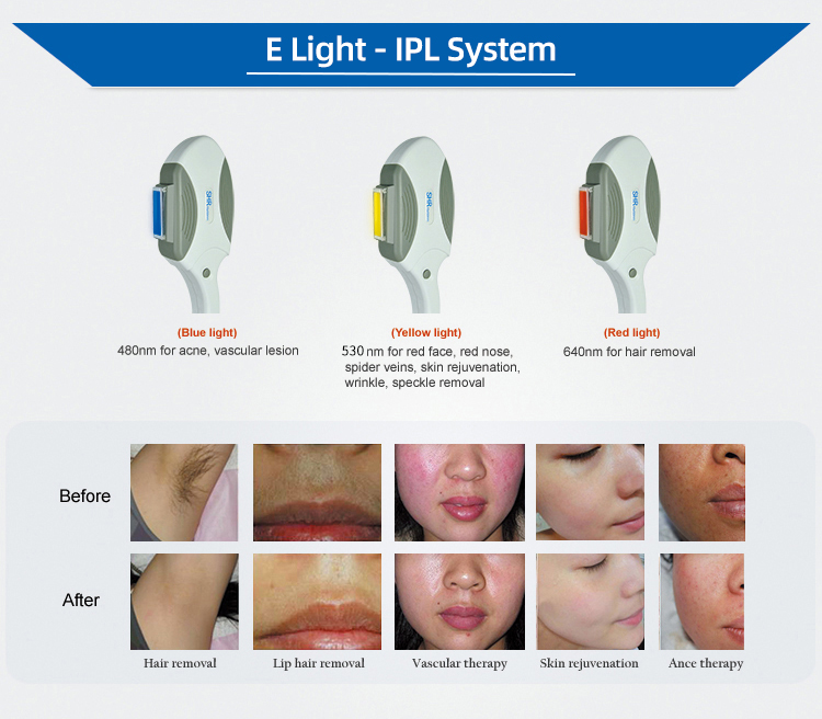 The core technology of E-light beauty skin therapy has three points : RF + light energy + epidernal cooling , which fully combines the respective advantages of light energy (IPL) and (RF) radio frequency , and utilizes the selective absorption of light energy by the skin to cause target tissue at a lower itensity of light energy , so that the tissue reches a desired temperature rise . Radio frequency penetrates deep into the skin , has no selective absorption , and its cinductivity in the skin is closely related to temperature .E-light beauty skin therapu combines the advantages of light energy and radio frequency , and utillzes the selective absorption of light energy by the skin to strengthen the absorption of radio frequency by skin tissue . At the same time , the RF surface contact cooling technology eliminates the discomfort and complications caused by the intense heat of the strong light , ans has a breakthrough in efficacy and safety.