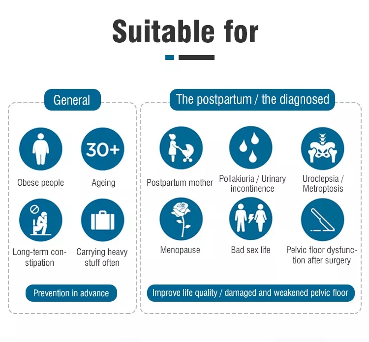 By utilizing high energy focused electromagnetic wave, the high-magnetic pulses generate a directional motion force, stimulating motoneuron to activate and control pelvic floor muscle contractions, accelerate collagen regeneration to solve problems of vaginal sagging, pelvic floor muscle sagging, uroclepsia, metroptosis, etc.