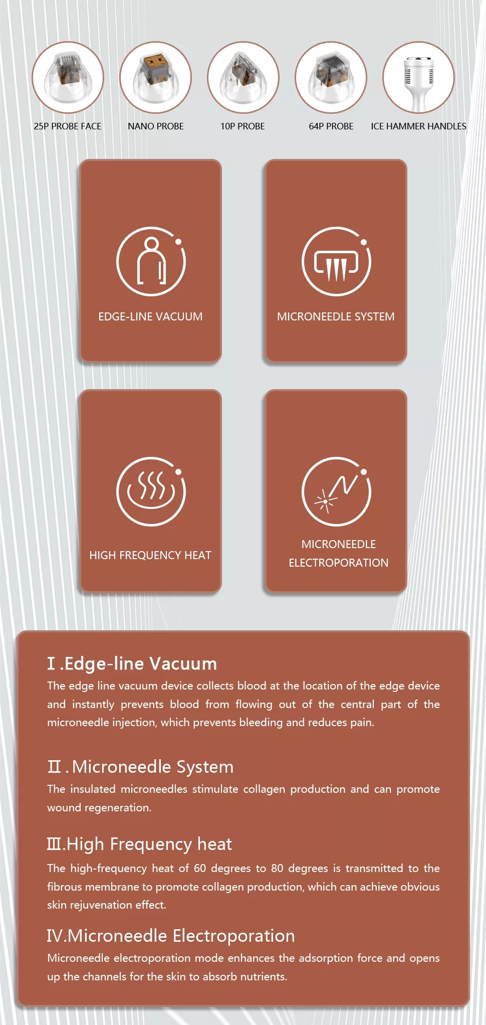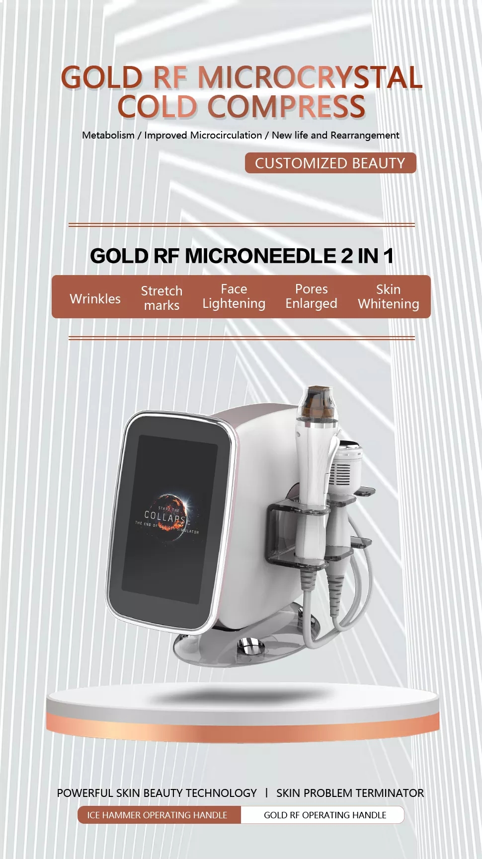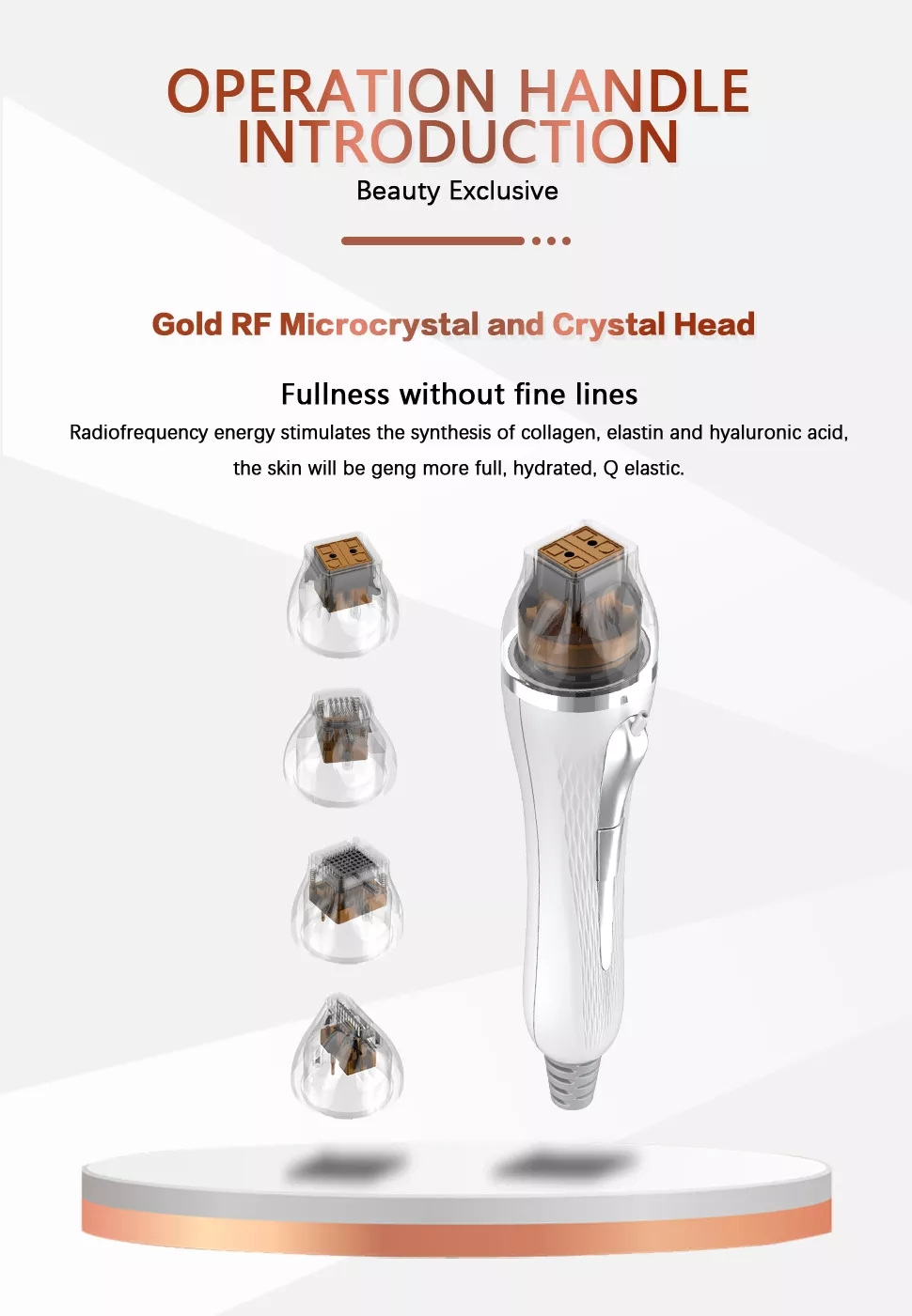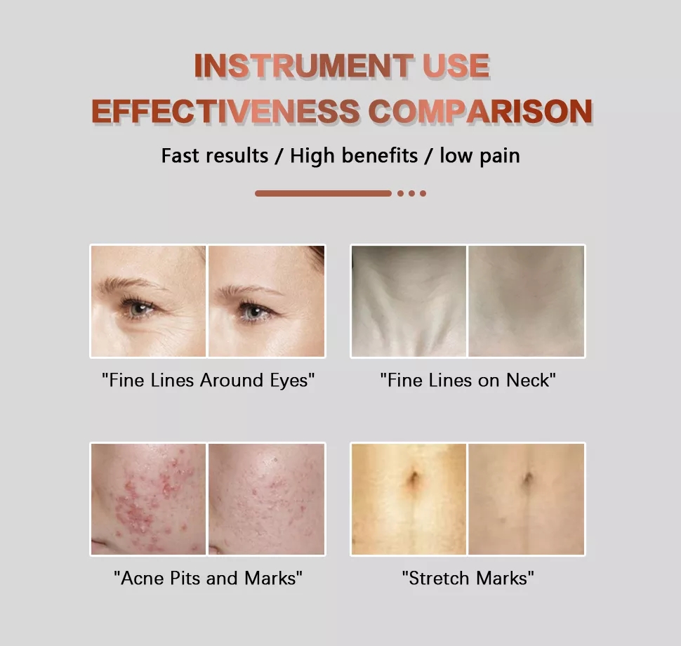 1.Micro-crystal mechanical stimulation , combined with biological effects and thermal stimulation which produced by RF, arouse skin self-healing system, promote metabolism, improve micro-circulation, start collagen's regeneration and rearrangement.