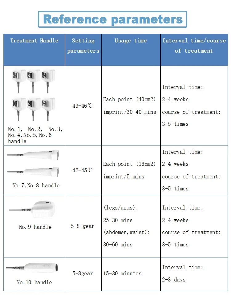 The device is equipped with 10 unique radio frequency device treatment handles, and different handles are applied to different parts.No consumables, no pain, no downtime, return to normal activities and exercise immediately. The most special 6 flat fixed treatment handles and 2 handles flat fixed treatment handles break through the traditional radio frequency mobile operation, bringing a safe, efficient, fast and most comfortable experience, and can be easily used without an operator.