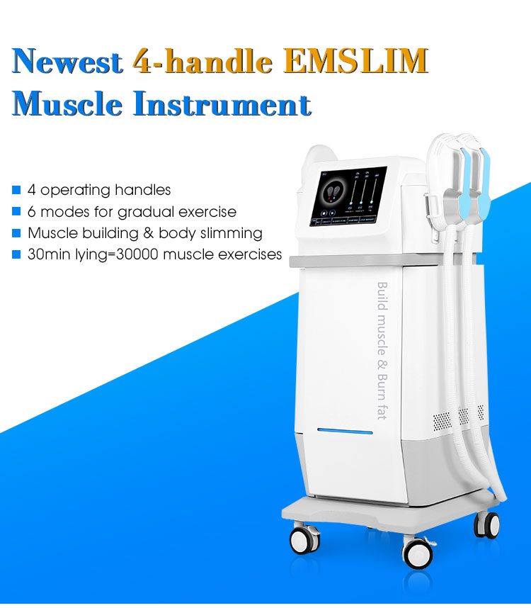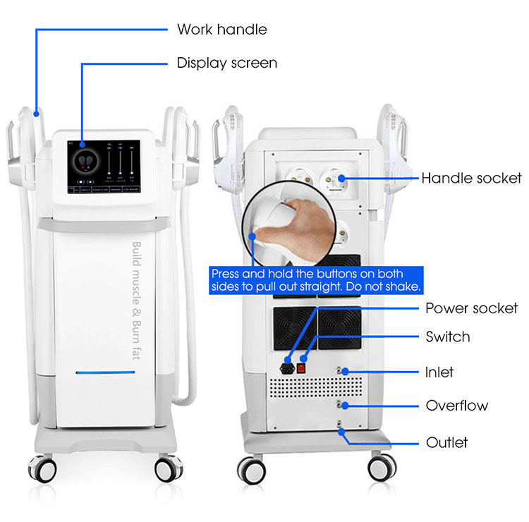 beauty muscle instrument uses non-invasive ecological to release high-frequency magnetic vibration energy through two large treatment handles to penetrate the muscles to a depth of 8cm, and induce continuous expansion and contraction of muscles to achieve high-frequency extreme training ,to deepen the growth of myofibrils (muscle enlargement), and produce new collagen chains and muscle fibers (muscle hyperplasia), thereby training and increasing muscle density and volume.The 100% limit muscle contraction of EMS technology can triger a lot of lipolysis, Fatty acids are broken down from triglyceric acid, and accumulated in large amounts in fat cells. The fatty acid concentration is too high, which will cause fat cells to apoptosis and be excreted from the body by normal metabolism within a few weeks. Therefore, EMS beauty muscle instrument can strengthen and increase muscles while achieving the effect of reducing fat.