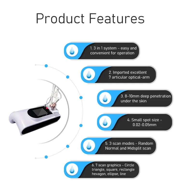 CO2 Fractional laser is the most advanced conceptual fractional CO2 skin peeling laser system with a wavelength of 10600nm. In addition to its fine skin-peeling effect, it can effectively penetrate the laser beam into the dermis .