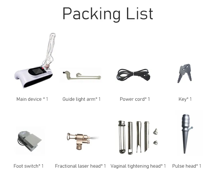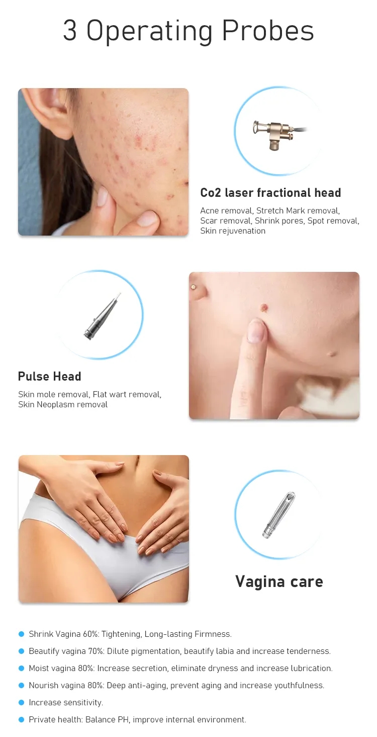 | Treatment heads | 5pcs (Fractional, Normal co2 laser, 3pcs Vaginal heads) |