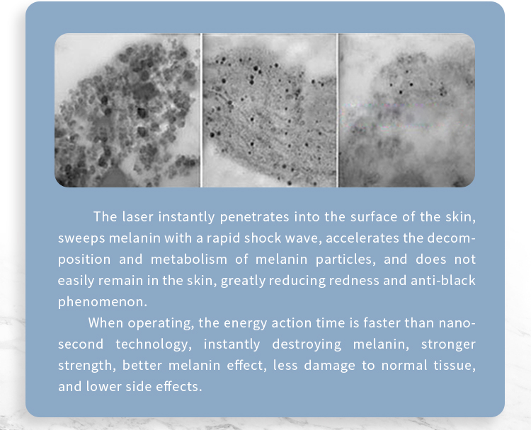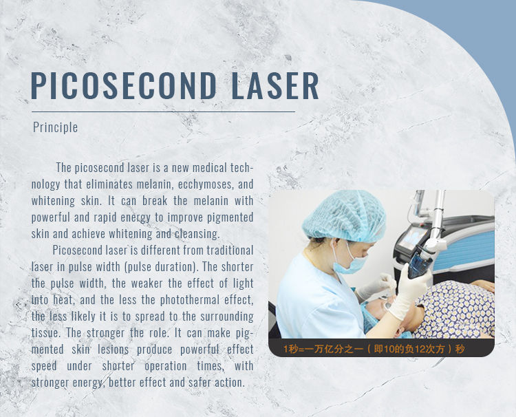 Picosecond laser is a new technology for pigment removal and skin whitening, with a powerful and fast energy to shatter the pigment directly, remove pigmentation skin and achieve whitening skin.