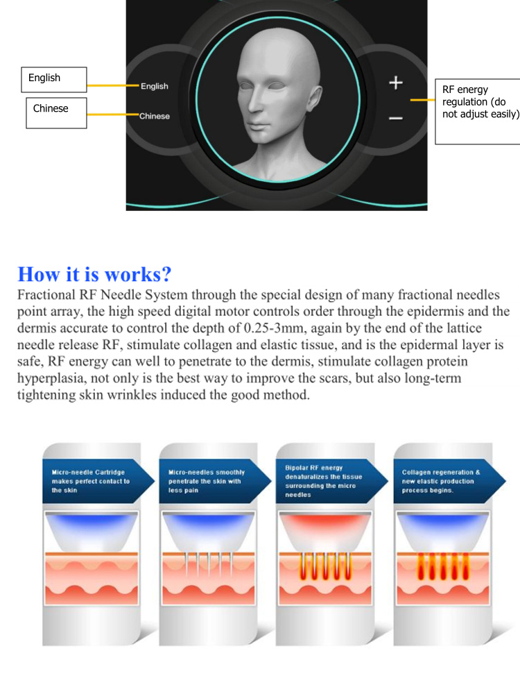2.RF penetrates deep skin, generating heat to promote blood circulation and metabolism, accelerate collagen contraction and regeneration to tighten skin, reduce wrinkles and increase elasticity. 3.Vacuum suction combined in the RF microneedling handle allows needles to penetrate skin to realize its function.