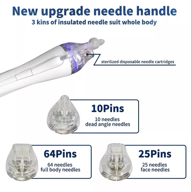 3. 4 microneedling heads —— 10 pins, 25 pins, 64 pins, nano.