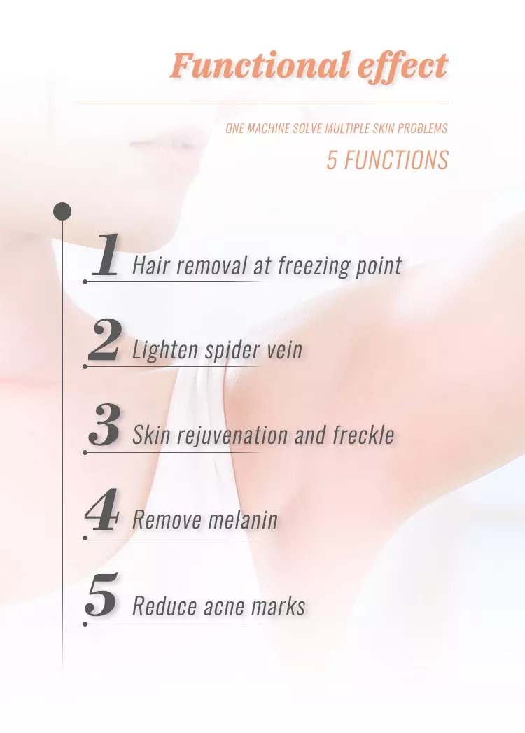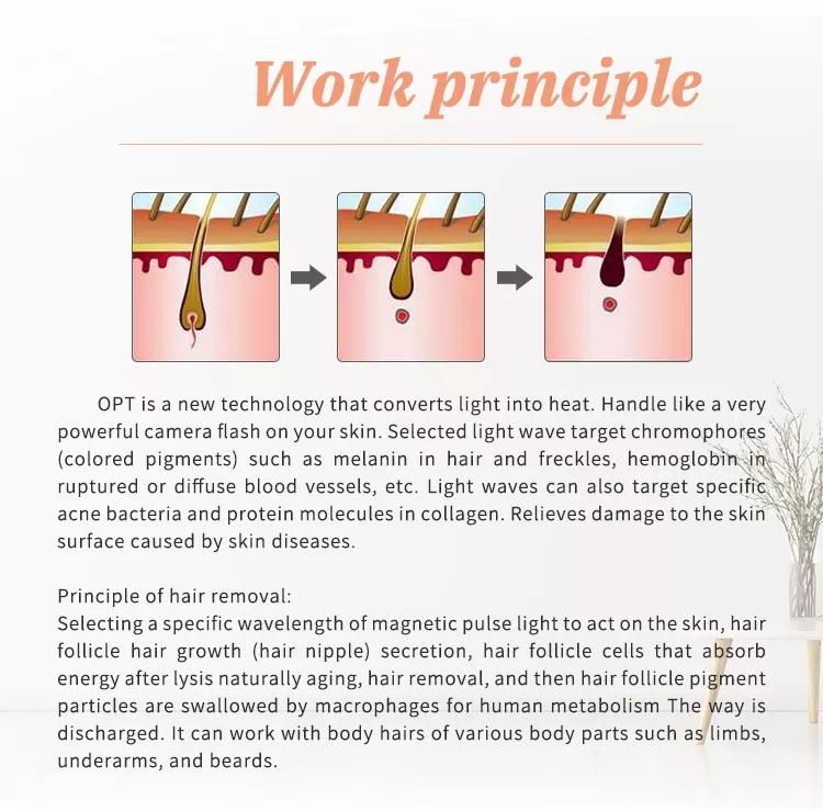 Selecting a specific wavelength of magnetic pulse light to act on the skin, hair follicle hair growth (hair nipple) secretion, hair follicle cells that absorb energy after lysis naturally aging, hair removal, and then hair follicle pigment particles are swallowed by macrophages for human metabolism The way is discharged. It can work with body hairs of various body parts such as limbs, underarms, and beards.