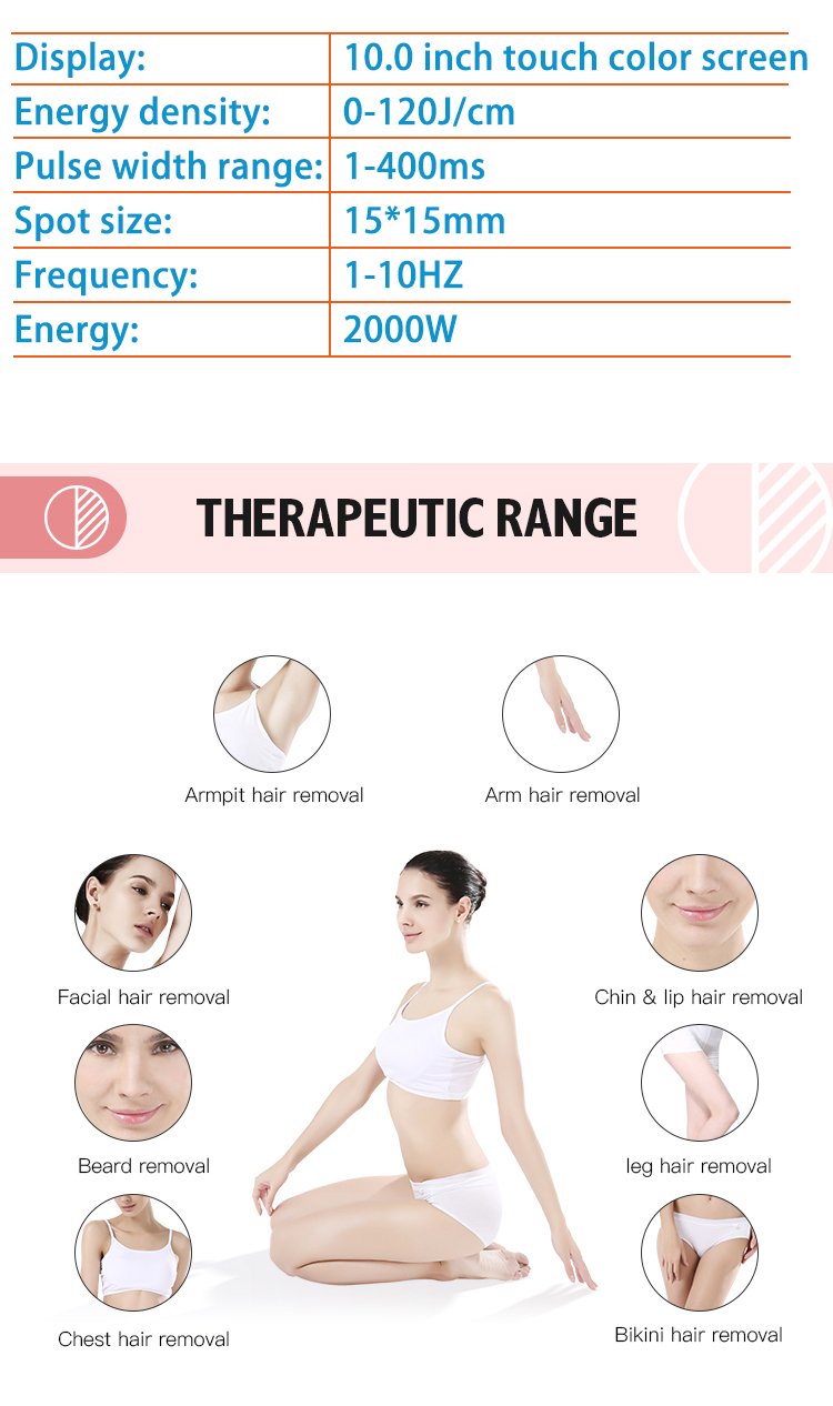 With adjustable 20-950ms pulse width, good absorption peaks, gentle mode of action ,it applies to all six categories of skin type and thickness of hair and combined with the TEC sapphire contact cooling system to maintained at -5 ° C to 5 °C, then skin feel the cool and freezing , thus it greatly reduce the pain of traditional hair removal methods, safety and comfortable, and it is very popular among the customers |