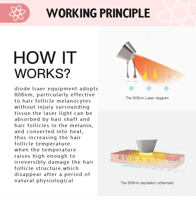 808 nm semiconductor laser is the best wavelength of pigment absorption, which can be absorbed by melanin of the hair follicle inside. hair removal is better than the traditional method of hair removal, hair removal required less times of treatment,The traditional hair removal methods cannot remove lips hair, etc.but it can be easily removed. |