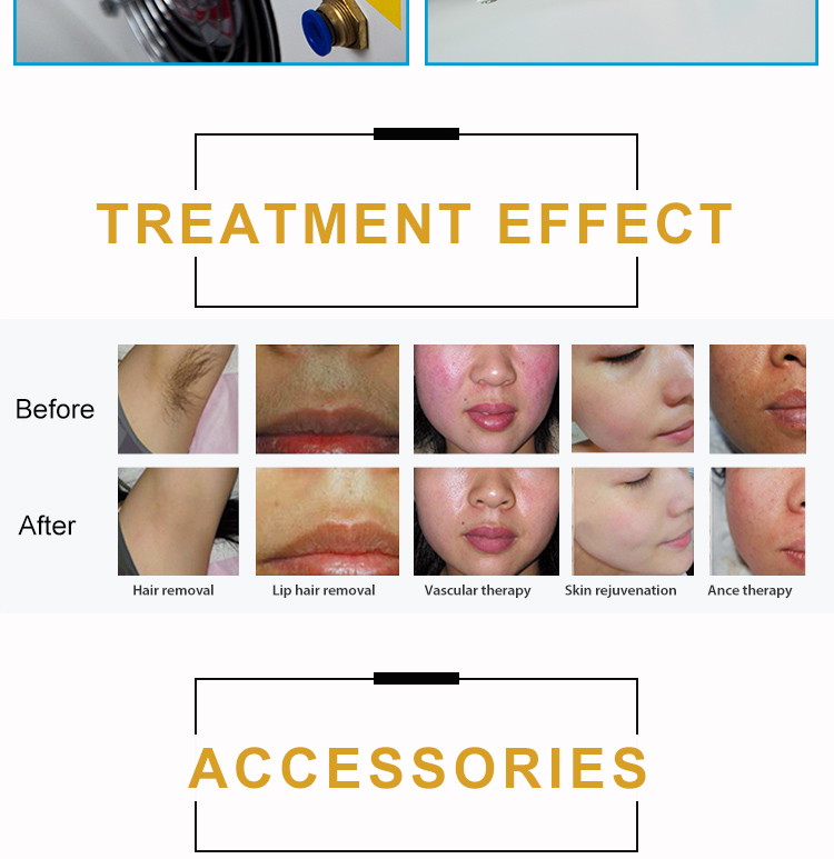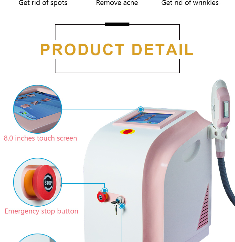 This thermal energy stimulates production of new collagen and re-arrange collagen tissue ,The subsequent heating further tightens the skin tissue and reduces wrinkles . the most importance is that the IPL with contact cooling system inside is effective on the epidermis that greatly reduce the pain during the treatment. The stable performance makes the safety in the whole process